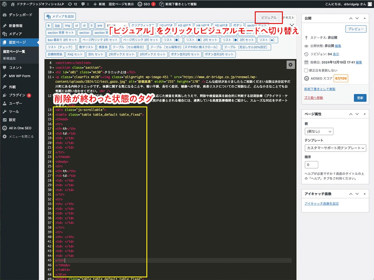- 「ビジュアル」タブをクリックしビジュアルモードへ切り替え