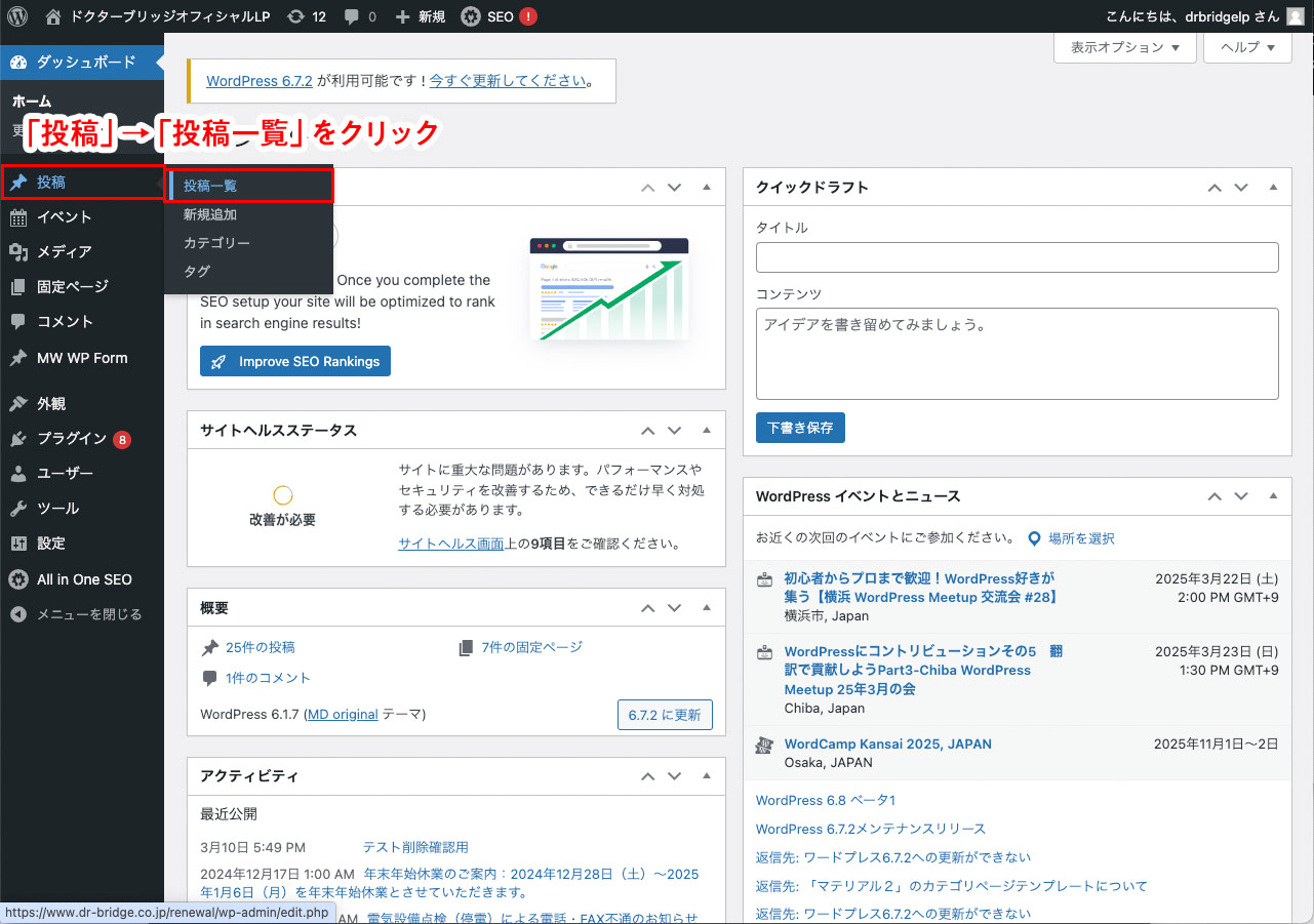 管理画面を開き、「投稿」→「新規追加」をクリック