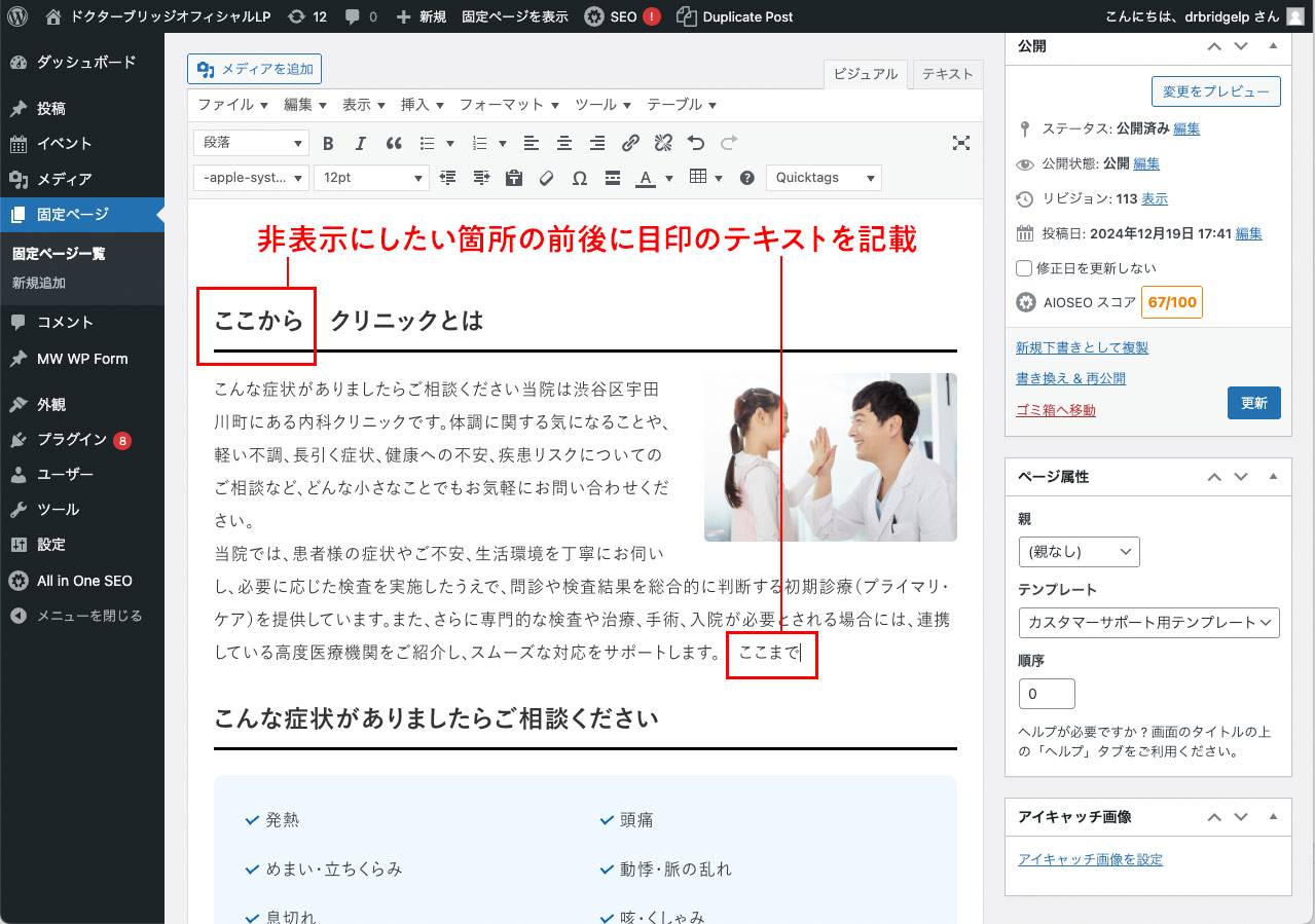 該当のページの管理画面を開き、非表示にしたい箇所の前後に目印のテキストを記載します。
